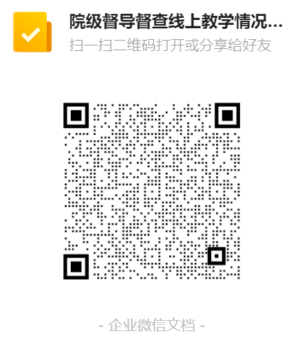 线上教学期间,各学院每周一17:00前通过企业微信提交前一周的《院级督导督查线上教学情况汇总》表(见下方二维码);