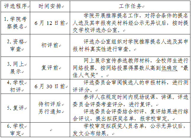 评选程序包括学院考察提名、资格审查、网上展示、学校初评、复评、学校审定等环节,具体评选程序及工作安排见表1。