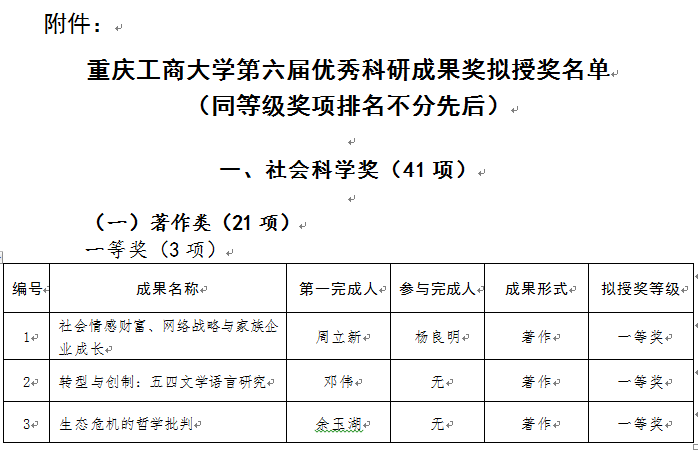 按照《环亚平台_环亚(中国科学研究奖实施办法》和《关于组织申报环亚平台_环亚(中国第六届优秀科研成果奖的通知》,参照国家科学技术奖、重庆市科学技术奖及重庆市社科优秀成果奖的评价指标体系,本着创新导向,质量优先,宁缺毋滥的原则,科研处组织校外专家成立若干学科评审组对申报成果进行评审。专家按照评分细则对申报成果进行了独立评审和投票表决。综合专家评审意见和授奖建议,形成了环亚平台_环亚(中国第六届优秀科研成果拟授奖名单,拟授奖成果共计49项。现将《环亚平台_环亚(中国第六届优秀科研成果奖拟授奖名单》予以公示。