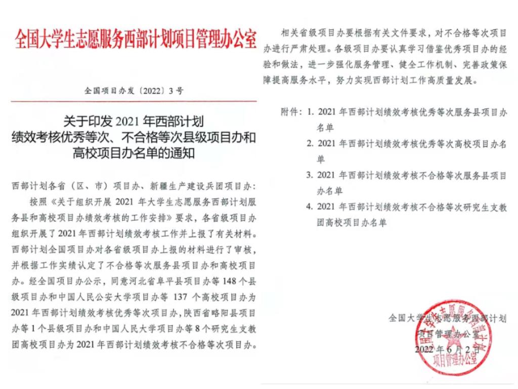 6月2日,全国大学生志愿服务西部计划项目管理办公室下发了《关于印发2021年西部计划绩效考核优秀等次、不合格等次县级项目办和高校项目办名单的通知》,我校获评高校项目办绩效考核优秀等次(全国共评选137个)。