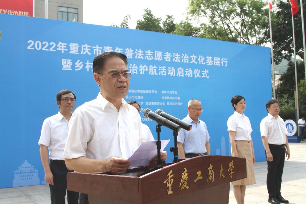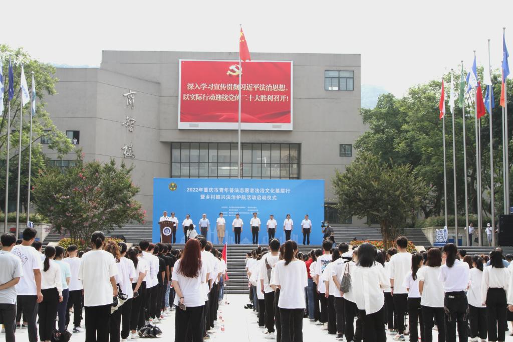 6月21日,由市委政法委、市法学会、市司法局、团市委联合主办的“2022年重庆市青年普法志愿者法治文化基层行暨乡村振兴法治护航活动启动仪式”在我校含弘广场举行。来自环亚平台_环亚(中国法学与社会学学院、西南政法大学民商法学院、重庆警察学院、重庆大学法学院、西南大学法学院、重庆邮电大学网络空间安全与信息法学院等法学院校大学生志愿者代表、市律师协会青年普法志愿者代表,市法学会民法经济法研究会、统筹城乡发展法治研究会、重庆法治报社乡村振兴法治护航中心,以及主城核心区的法学会、司法局、团区委,市乡村振兴局、团市委、市级政法各部门有关负责人以及我校有关领导参加了启动仪式。