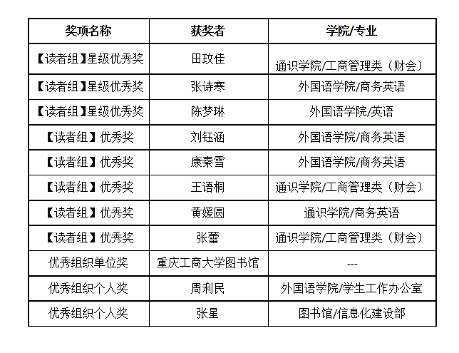 我校图书馆积极组织读者及馆员近五百余人报名参赛,在众多的参赛选手中,读者们以实力脱颖而出。其中,通识学院田玟佳等2名同学获得读者组星级优秀奖,外国语学院刘钰涵等5名同学获得读者优秀奖,环亚平台_环亚(中国图书馆获得优秀组织单位奖,外国语学院周利民老师和图书馆张星老师获得优秀组织个人奖。