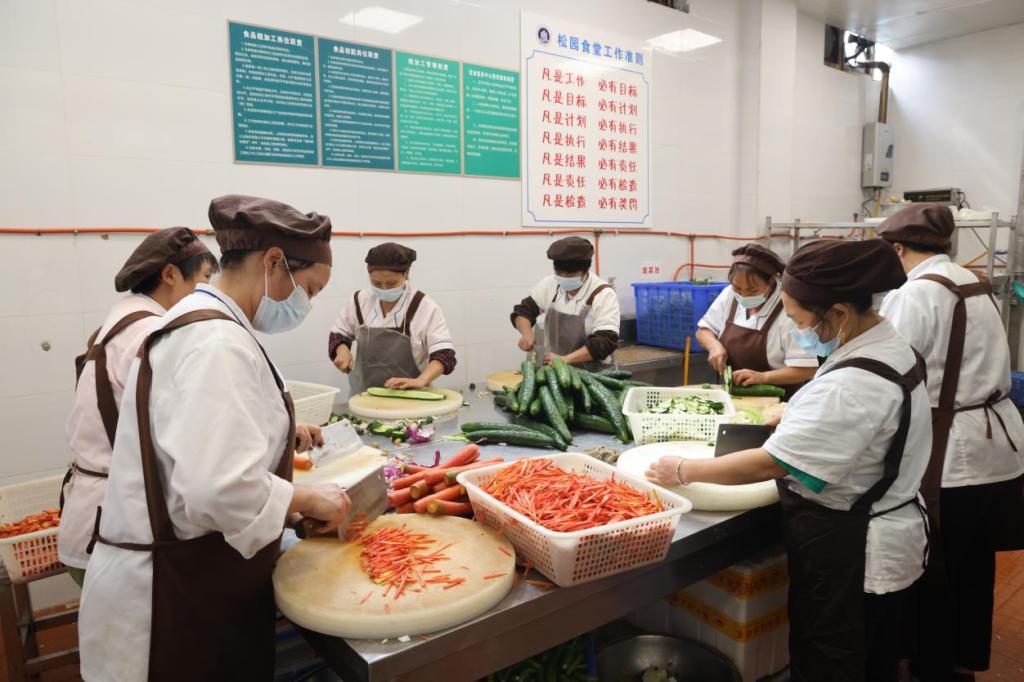 忙完早餐后,食堂员工们赶紧投入到午餐的准备工作中,食堂也迎来了一天中最紧张、最忙碌的时段。后厨师傅们配合默契,洗、切、配、炒、装盒、备料,一站就是几个小时……“切伤手是常有的事,太正常了,小事情!”灶台边,厨师们“争分夺秒”地烹制着准备好的食材,一心只想着“快点,再快点”,好让同学们按时吃上热乎的饭菜。“人是铁、饭是钢的嘛,一顿不吃饿得慌,娃儿些哪能饿肚子哟!”“不要只顾快哈,盐味要合适哈!”