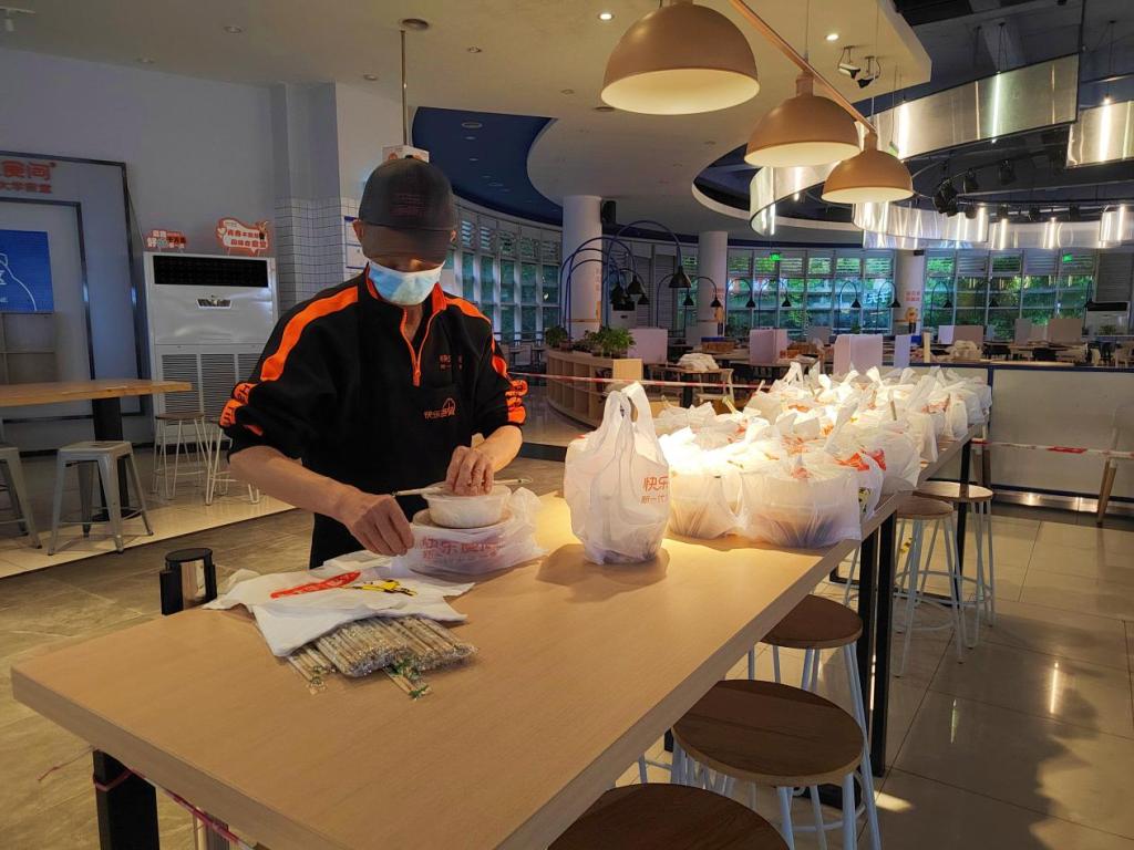 临近中午,香气扑鼻的午餐制作好了,厨师们将菜品转交给分餐员。分餐人员开始开餐盒、装菜肴、备餐具、封餐盒、打包……午餐配送前,消毒员再一次对餐车进行全面消毒处理,做好最后的准备。送餐员则根据配送信息,仔细清点餐品数量,迅速装箱装车。回到食堂,收拾后厨,做好清洁卫生后,时间已经接近14:00。“赶快抓紧时间吃饭哈,吃完饭去做核酸,完了赶紧回来哟!”