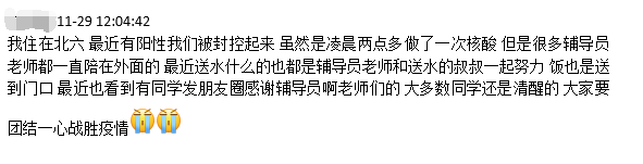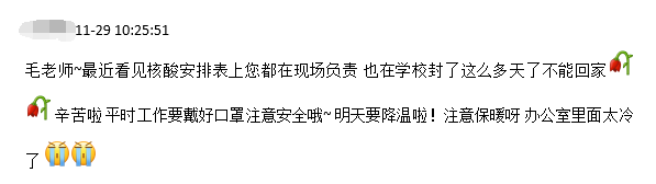 本轮疫情发生以来,学校各条战线的教职员工积极响应号召,第一时间入住学校,投身到疫情防控相关工作中。在他们当中,学生工作队伍的老师们是最贴近学生的一群人,他们每天都要在办公室、核酸检测点、学生公寓来回奔波, 提醒学生做核酸、为学生送生活物资、和师傅一起给学生宿舍送水、给隔离学生送饭、协助流调溯源工作……