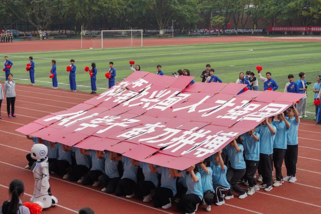 本次运动会结合了学校70周年校庆纪念活动,融入了丰富的校庆元素。入场式上,伴随着慷慨激昂的《运动员进行曲》,国旗护卫队、运动会会旗队、标语牌队、彩旗队、25支师生运动员方阵和代表队方阵,以及特邀校友会方阵穿着整齐的服装,通过极具创意的表演与口号,以饱满的热情、整齐的步伐通过主席台。团结奋进的标语、别出心裁的展板、丰富精彩的表演、铿锵有力的口号和迎风招展的旗帜,无不展现出各代表队健康自信、昂扬向上、积极进取的精神风貌;展现出我校师生的蓬勃朝气和青春活力;展现出运动员们将用激情点燃赛场、以汗水拼搏荣誉的斗志和决心,为本次运动会开幕式增添了一抹亮丽的色彩。