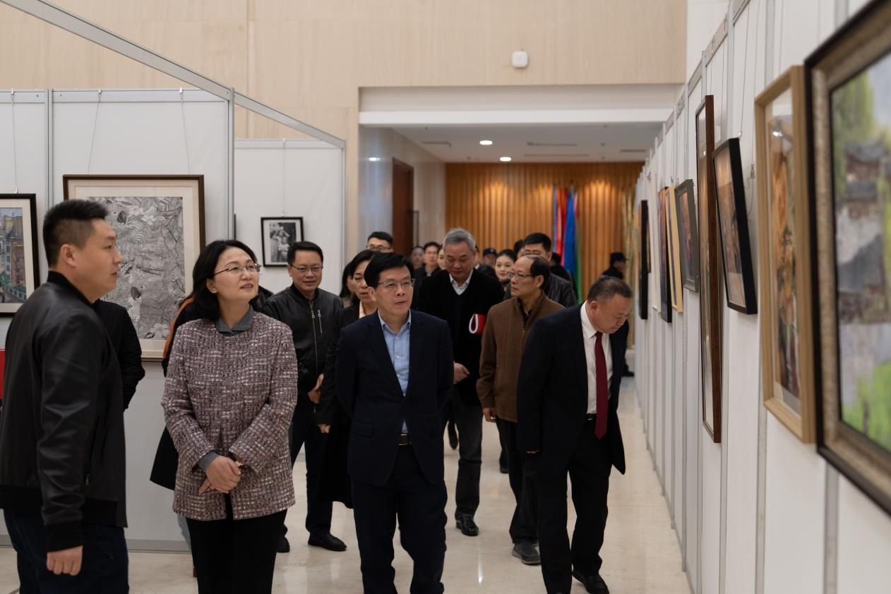 开幕式结束后,与会领导、嘉宾参观学生优秀艺术作品及高校校长书画摄影作品展。