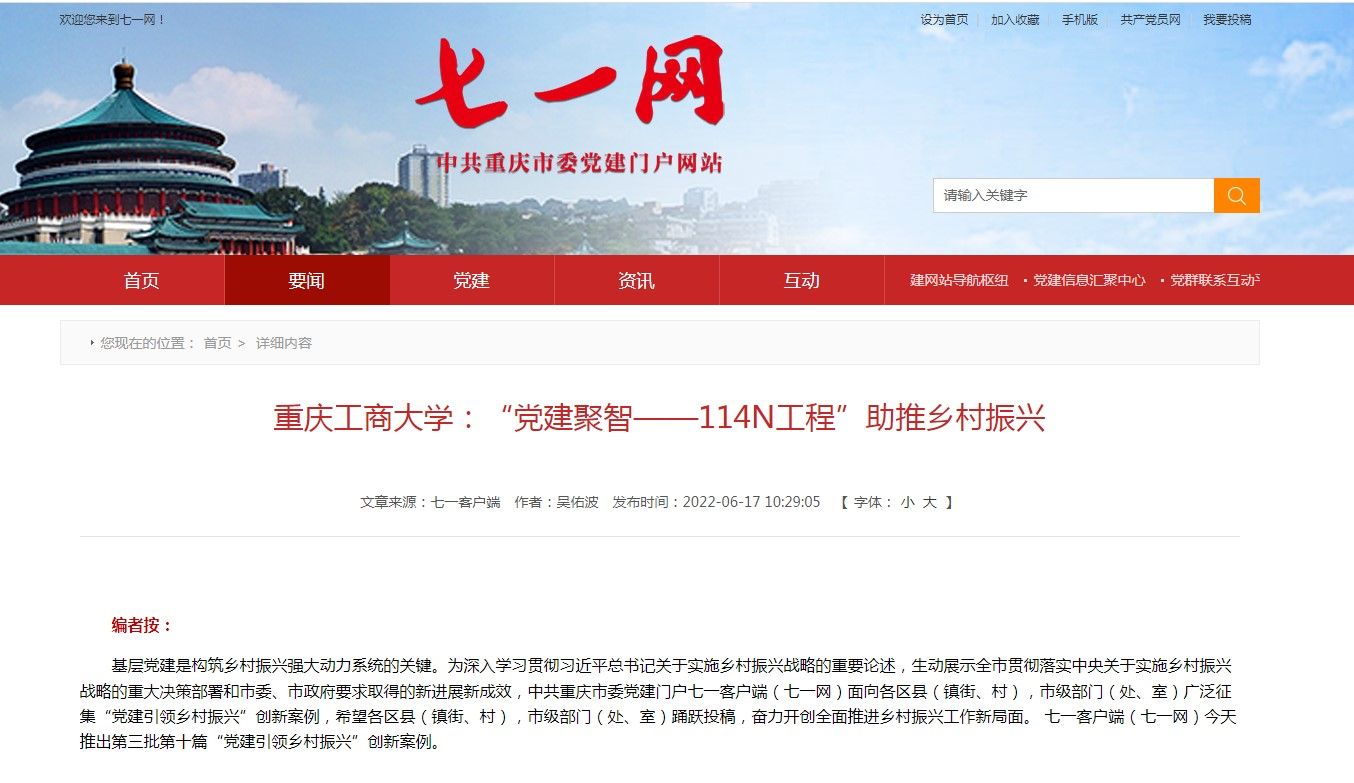 我校入选的新闻于2022年6月在中共重庆市委党建门户网站“七一网”发布,同时当年也入选了重庆市党建引领乡村振兴创新案例“二〇二二年十佳案例”。