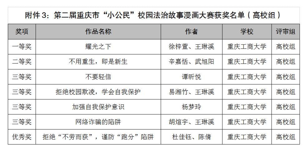 近日,由重庆市高级人民法院、重庆市教育委员会及共青团重庆市委员会主办的第二届重庆市"小公民”校园法治故事漫画大赛获奖名单公布,我校艺术学院学生作品在高校组中荣获一等奖1项、二等奖1项、三等奖4项及优秀奖1项。