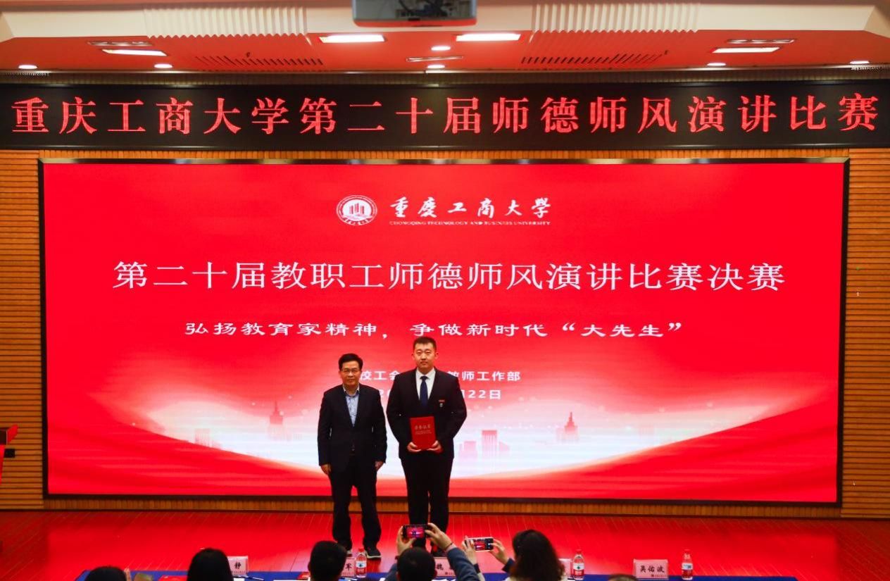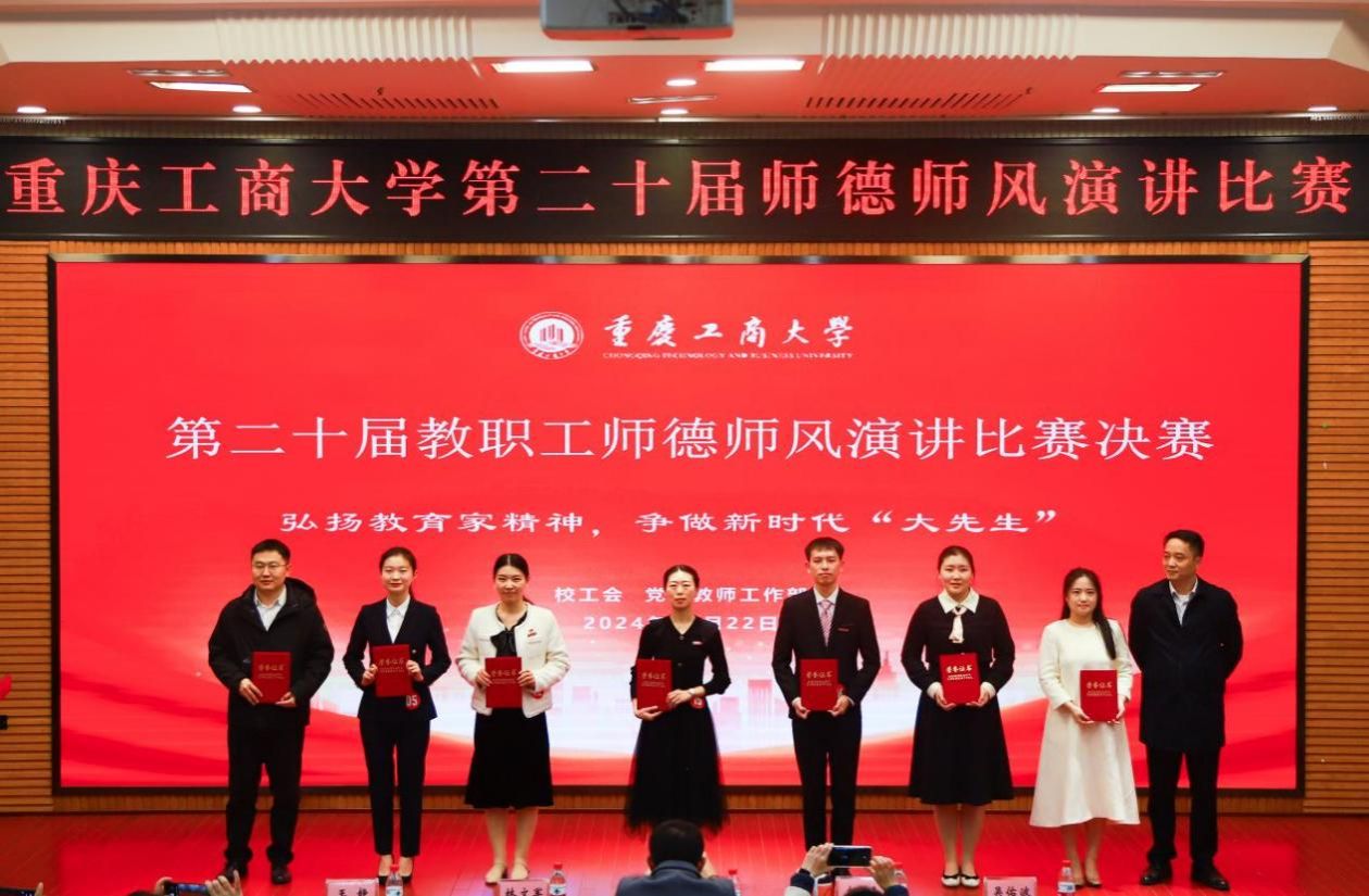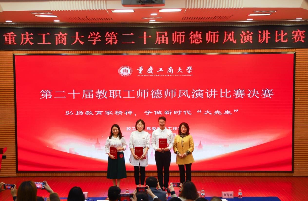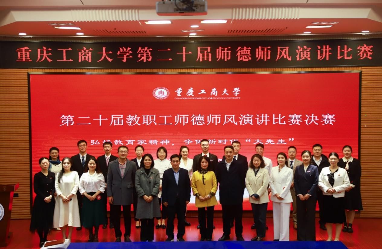11月22日下午,由校工会、党委教师工作部联合举办的“立足新时代·当好主人翁·建功工商大”第二十届教职工师德师风演讲比赛决赛在博智楼7200学术报告厅举行。学校党委书记曾维伦,党委副书记、工会主席宋豫,党委常委、副校长张波、李国军,各学院党委/党总支书记、各部门工会主席以及教职工代表等观看了决赛。决赛邀请了重庆第二师范学院文学与传媒学院副教授魏巍,我校机关党委书记、组织部副部长杨倩,党委教师工作部部长、人事处处长林文军,工会常务副主席王静,团委书记吴佑波担任评委。
