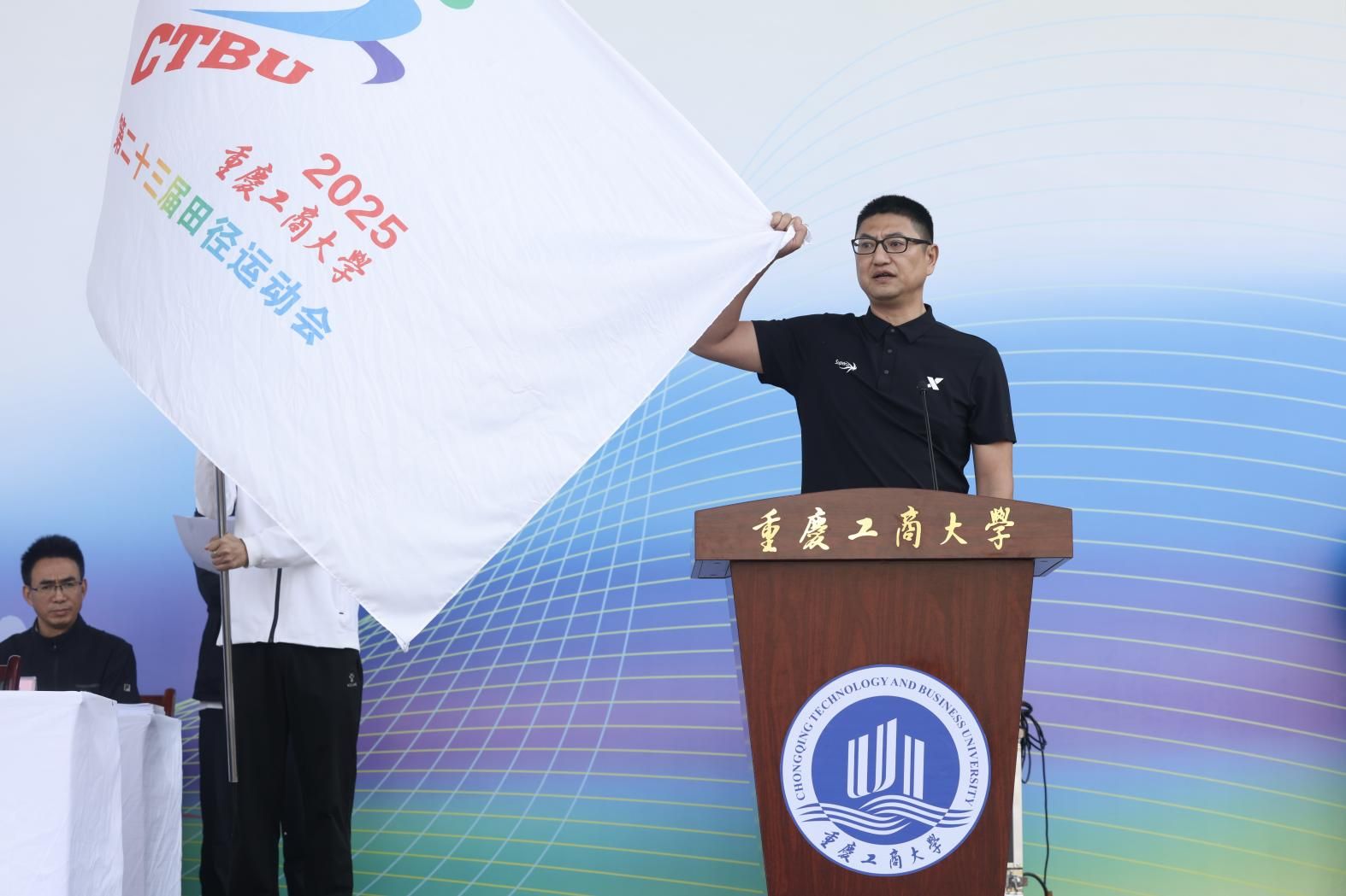 体育学院教师蒋愉、通识学院学生陈琪分别作为裁判员和运动员代表庄严宣誓,承诺以公平公正的态度和拼搏进取的精神参与赛事。