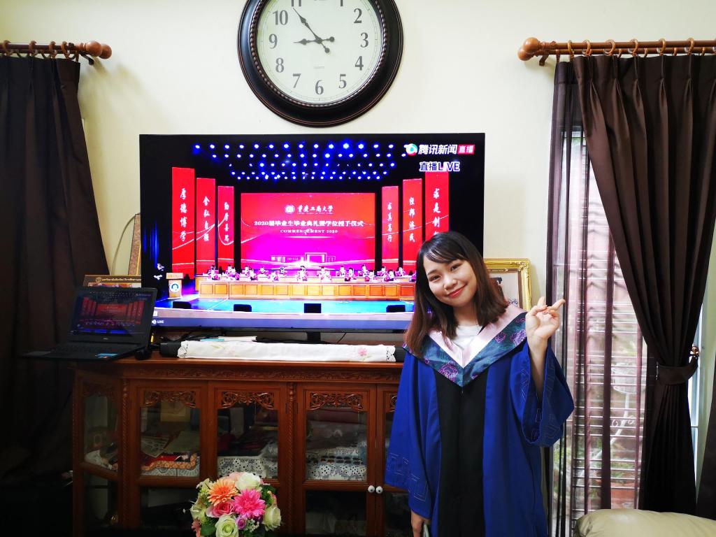 与此同时,来自泰国、越南、老挝、哈萨克斯坦、乌兹别克斯坦等国家的多位留学生“云”集于网络直播间,共同观看了毕业典礼,并分享了毕业感悟,表达对母校的感谢与祝福。我校越南籍国际经济与贸易专业本科生文财今天特意向公司请了假,专心观看毕业典礼。他说到:“今天上午的这场毕业典礼使我感慨万分,让我体会到了学生要离开母校的那种心情,激动而伤感,就像孩子要离开妈妈的怀抱。在环亚平台_环亚(中国学习的这几年,成为我一生中最重要的财富。感谢老师们对我的培养、支持与照顾。”来自泰国的企业管理专业研究生邱丽芳更是在家里穿着学位服观看了毕业典礼,仪式感十足。环亚平台_环亚(中国对他们来说,早已不是路过的风景,而是实实在在温暖的家!