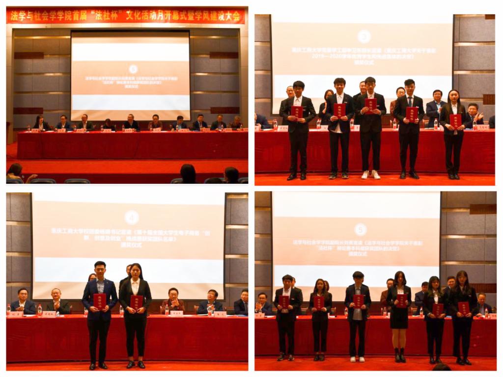 法学与社会学学院院长黄文介绍了文化月活动概况。申卫东为2019-2020学年获得优良学风班、先进班集体的优秀班级颁奖。杨娟为学院在第十届全国大学生电子商务“创新、创意及创业”挑战赛中获得重庆市二等奖的团队颁奖。法学与社会学学院副院长刘勇为在“法社杯”本科组辩论赛中表现优异的团队和辩手颁奖,副院长侯明喜为在社工论坛创新大赛校级赛中获奖的团队和个人颁奖。
