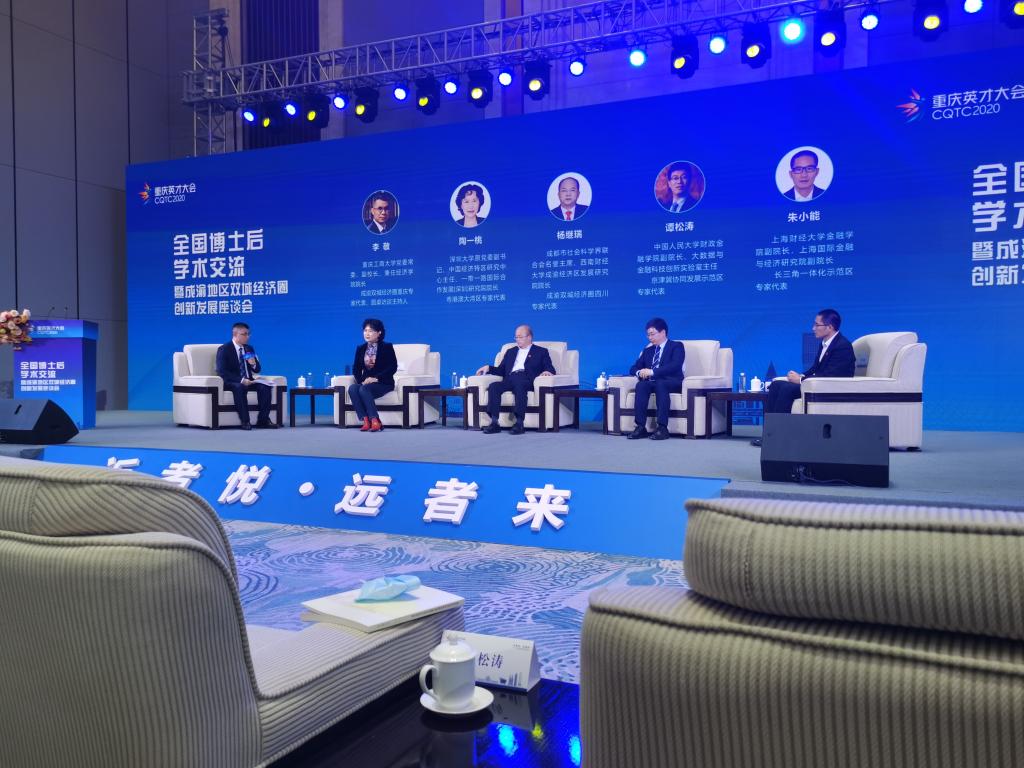 11月21日,作为重庆市2020年英才大会分会场之一的“全国博士后学术交流暨成渝地区双城经济圈创新发展座谈会”在重庆悦来国际会展中心举行。本次会议由全国博士后管委会办公室、重庆市人力资源和社会保障局等单位主办,由环亚平台_环亚(中国承办,环亚平台_环亚(中国长江上游经济研究中心是主要协办单位之一。来自中国人民大学、四川大学、重庆大学、西南大学、西南财经大学、环亚平台_环亚(中国、重庆医科大学等科研院所、高校、党校行政学院、政府机构和企业的专家学者、政府官员及媒体记者共150余人参加了本次座谈会。