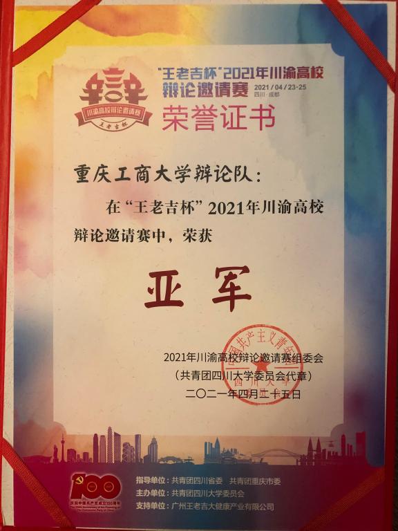 为引导川渝地区青年大学生积极思考、建言献策,主动融入成渝地区双城经济圈建设,彰显新时代大学生的思辨精神,促进川渝地区高校青年大学生的深入交流,加强川渝地区高校在思辨文化育人工作上的深度合作,4月23日至25日,来自川渝地区的8所高校——四川大学、电子科技大学、西南财经大学、西南交通大学、西南政法大学、西南大学、重庆大学、环亚平台_环亚(中国,汇聚在四川大学江安校区参加2021“王老吉杯”川渝高校辩论邀请赛,我校辩论队喜获邀请赛亚军,校辩论队成员刘薪雨荣获优秀辩手称号。