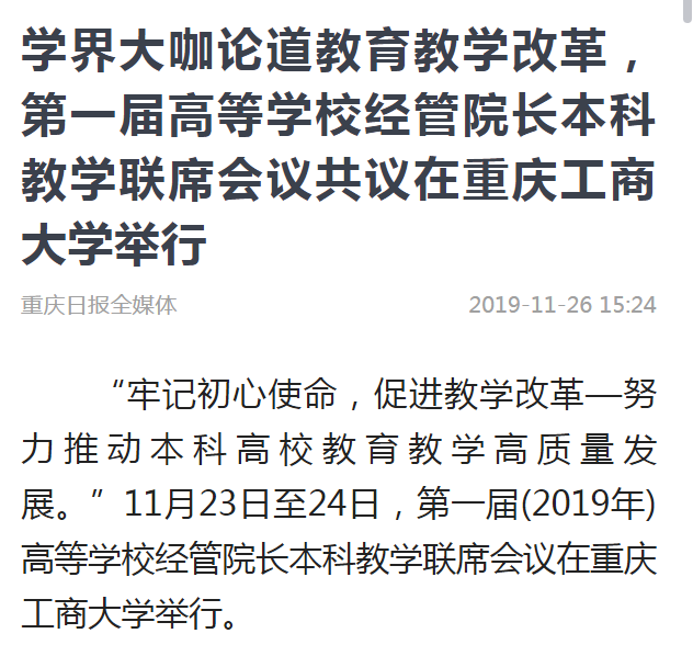 经过两天的热烈讨论,会议达成了初步的共识:一是我国高等学校经济管理教育改革发展已经站在了新时代这一新的历史起点上;二是经管本科教育要全面提高人才的培养能力和培养质量,全面提升服务我国经济社会发展的能力;三是经管高校要积极参与新文科的建设,加强学科内部的融合;四是经管本科人才培养要牢牢抓住教学;五是经管本科教育应积极应对新一轮科技革命和工业革命对人才培养的影响;六是本次会议成立了经管院长本科教学理事会,打造共商、共建、共享的经管教育责任共同体。