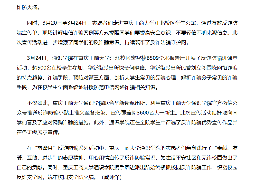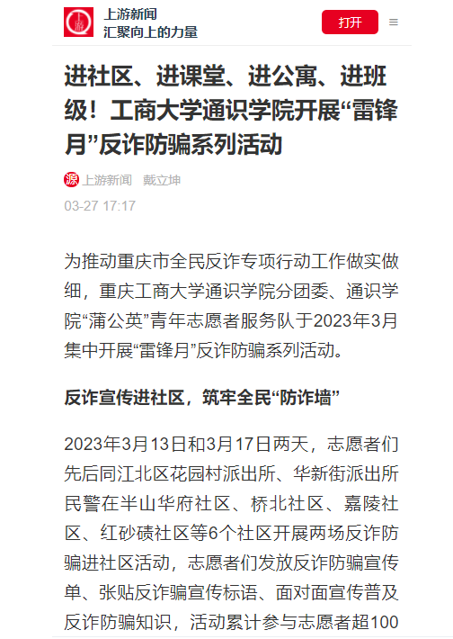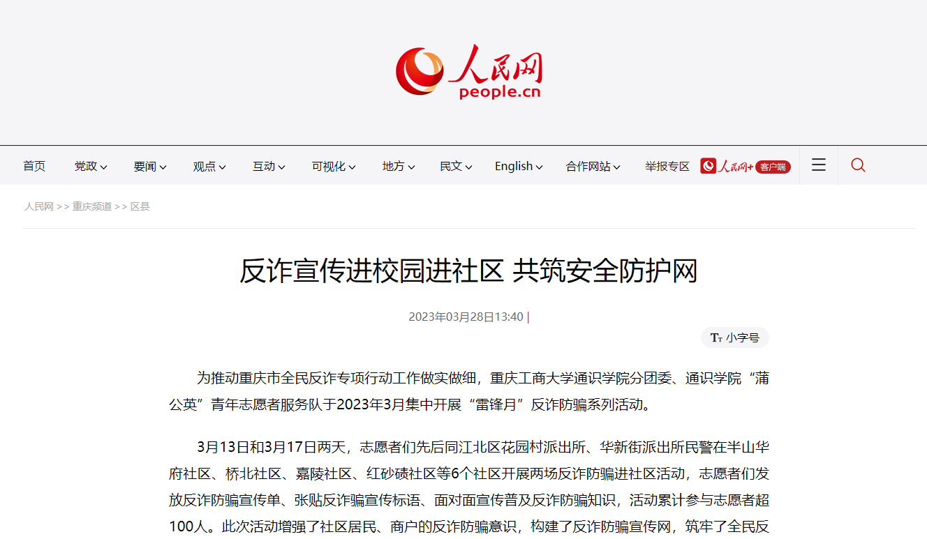近日,人民网《反诈宣传进校园进社区 共筑安全防护网》为题、上游新闻以《进社区、进课堂、进公寓、进班级!工商大学通识学院开展“雷锋月”反诈防骗系列活动》报道我校通识学院开展“雷锋月”反诈防骗系列活动。