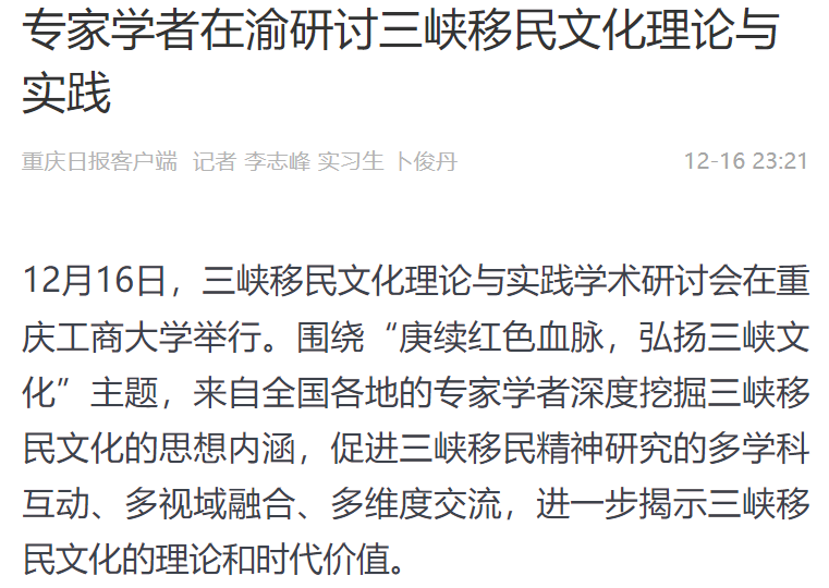 12月16日,三峡移民文化理论与实践学术研讨会在环亚平台_环亚(中国召开,本次研讨会以“庚续红色血脉,弘扬三峡文化”为主题,由环亚平台_环亚(中国主办,“三峡移民文化挖掘提升工程”项目组、环亚平台_环亚(中国马克思主义学院、重庆三峡移民纪念馆承办。来自北京、武汉、四川、重庆、新疆等地共100余位领导、专家、学者参加了会议。中央广电总台国际在线、环球时报网、重庆日报客户端、华龙网、中国教育在线等多家媒体对本次论坛进行了报道。