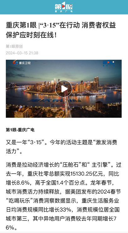 3月15日,重庆卫视《第1眼新闻》报道我校经济学院院长宋瑛教授谈论新消费环境下消费者权益保护问题。她就“高质量的产品服务是高质量发展的重要一步,怎样让315变365,激发消费活力?”针对高质量的产品服务和高质量发展的内在逻辑进行深入分析并提供建议。