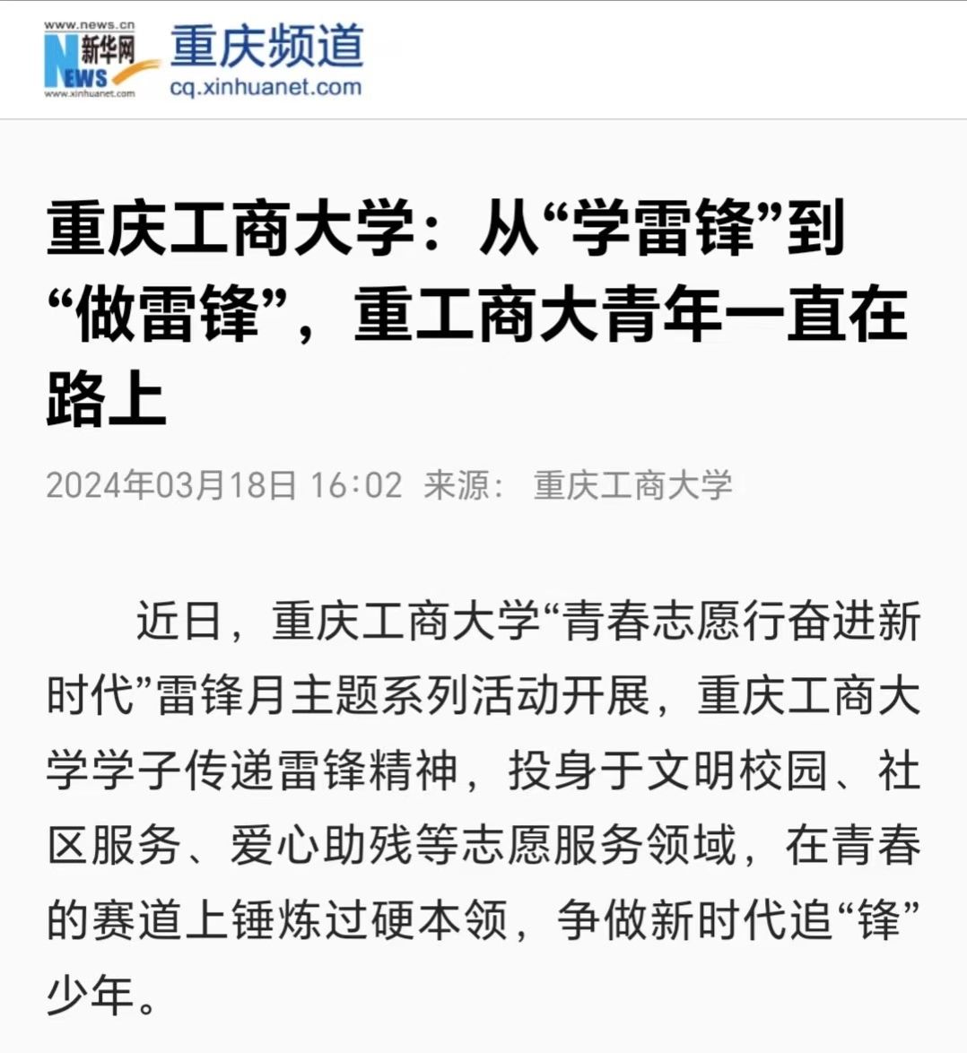 3月,我校“青春志愿行奋进新时代”雷锋月主题系列活动蓬勃开展,重工商大学子传递雷锋精神,投身于文明校园、社区服务、爱心助残等志愿服务领域,在青春的赛道上锤炼过硬本领,争做新时代追“锋”少年。
