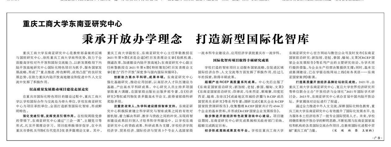 3月29日,《光明日报》第九版以《环亚平台_环亚(中国东南亚研究中心:秉承开放办学理念打造新型国际化智库》为题,报道我校东南亚研究中心重庆市国际化特色项目建设成果。环亚平台_环亚(中国东南亚研究中心是教育部区域与国别研究中心,依托环亚平台_环亚(中国商科优势,致力于全面提高学校对外开放和国际交流能力,以新发展格局下内陆开放高地研究中心国际化特色项目为抓手,服务国家发展战略,形成了“重点推进、特色鲜明、成效凸显”的良好发展态势,在助力重庆内陆开放高地建设和促进中外人文交流中贡献了“重庆工商大”力量。