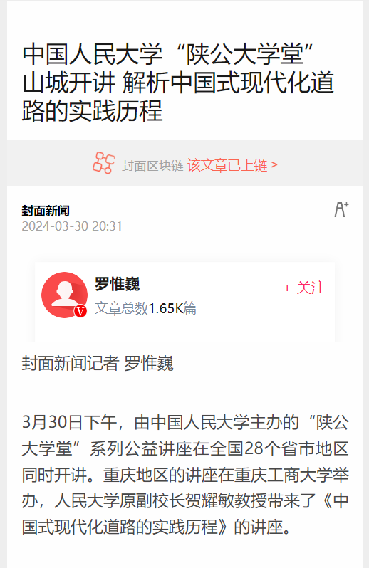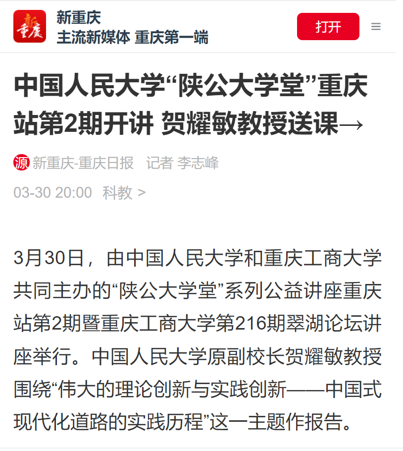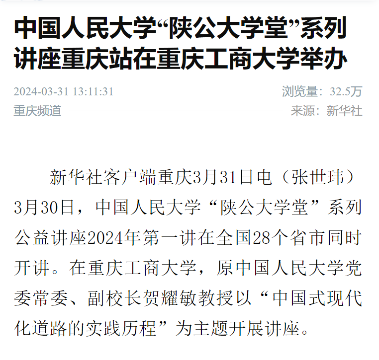 3月30日下午,中国人民大学“陕公大学堂”系列公益讲座走进环亚平台_环亚(中国,在我校博智楼7200报告厅成功举行。中国人民大学原党委常委、副校长贺耀敏教授围绕“伟大的理论创新与实践创新—中国式现代化道路的实践历程”作主题讲座。新华社、重庆日报、重庆新闻联播、华龙网、上游新闻、封面新闻等主流媒体对此进行了报道。