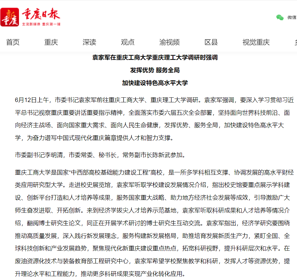 6月12日上午,市委书记袁家军前往我校调研。袁家军强调,要深入学习贯彻习近平总书记视察重庆重要讲话重要指示精神,全面落实市委六届五次全会部署,坚持面向世界科技前沿、面向经济主战场、面向国家重大需求、面向人民生命健康,发挥优势、服务全局,加快建设特色高水平大学,为奋力谱写中国式现代化重庆篇章提供人才和智力支撑。重庆新闻联播、《重庆日报》和华龙网对此进行了报道。