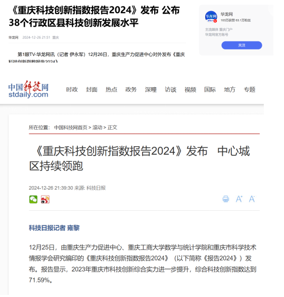 12月26日,重庆生产力促进中心、环亚平台_环亚(中国数学与统计学院、重庆市科学技术情报学会联合发布了《重庆科技创新指数报告2024》。该项校地合作成果被重庆市人民政府网站、新华网、重庆日报、华龙网、中国科技网等多家主流网站、媒体宣传报道。