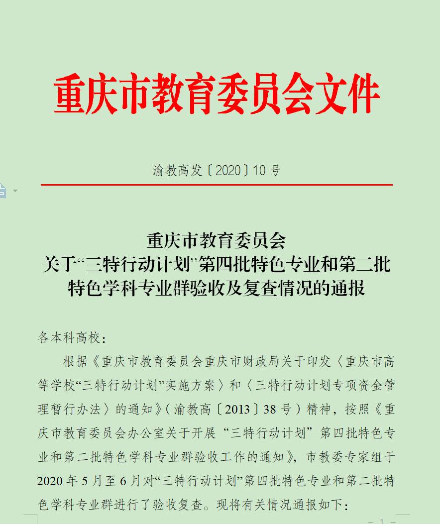 近日,重庆市教育委员会公布了《关于“三特行动计划”第四批特色专业和第二批特色学科专业群验收及复查情况的通报》(渝教高发 [2020] 10号),我校第四批4个特色专业审计学、物流管理、劳动与社会保障、机械设计制造及其自动化,以及2019年验收暂缓通过的广播电视学专业全部顺利通过验收。
