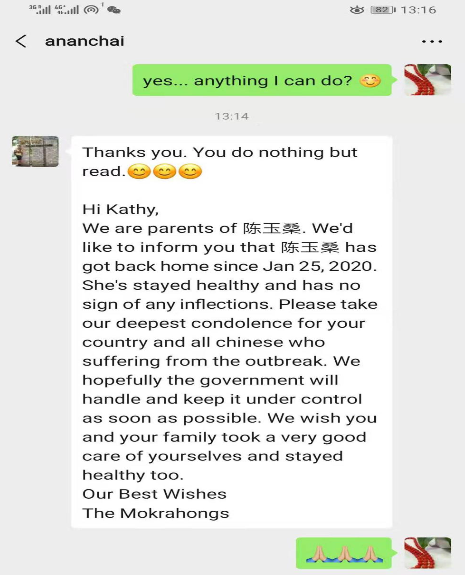留学生院从1月21日起,全面摸排100余名在册留学生的动向,建立了精细化的台账,跟踪记录包括已回国的留学生健康状况。利用留学生院公众号平台发布或转发相关信息近30条,日常的关心联系不计其数。留学生院教师24小时全方位在线,安抚留学生情绪,解决留校留学生的实际困难,与出入境管理部门、校外住宿留学生所在社区等保持沟通,以高度的责任感和使命感,做实做细每一项工作,确保我校留学生群体疫情期间的健康和平安。一名泰国籍留学生家长的致信学院:“我们是陈玉桑的父母,陈玉桑在1月25日的时候已经平安到家,在你们的关心和帮助下,她的身体健康,没有感染迹象。在此向中国和中国人民遭受疫情影响表示慰问和祝福。我们由衷希望中国政府能够尽快成功控制疫情发展,也祝愿学校师生平安,身体健康!”