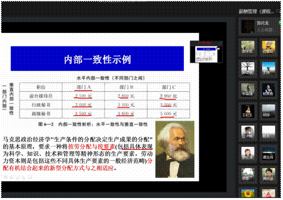 接着,郑月龙老师开展本次教学内容——薪酬结构设计,包括薪酬结构确定的流程和薪酬结构的内涵及关键性指标两个知识点。郑老师精心设计教学环节,采用多种教学方法,充分调动了学生学习的积极性、主动性。在教学中,郑老师首先回顾了与本次课内容相关的前续课程知识,薪酬体系设计基础和薪酬水平及外部竞争性;接着,对薪酬结构确定中的重点知识点内部一致性和外部竞争性,通过数据分析进行形象风趣的讲解,并结合马克思主义政治经济学,简单阐述了我国作为社会主义国家按劳分配与按要素分配有机结合的客观性。据此,郑老师着重指出以按劳分配和按要素分配为指导,具体到组织管理中就体现为按贡献分配,这是薪酬结构设计保证内部一致性的重要理论遵循;进一步地,郑老师在讲述薪酬结构关键性指标,如薪酬区间变动率、薪酬比较比率等,强调按贡献分配在其中的贯彻和体现,并结合习近平总书记2018年新年贺词“幸福都是奋斗出来的”、2019年9月1日开学第一课“立鸿鹄志,做奋斗者”的思想内涵,从人力资源管理学科知识融合的视角,借助《管理学》《积极心理学》《劳动经济学》等课程内容,指出薪酬结构设计作为一项管理活动,应该能够营造一种良好的氛围,让员工能够在这种氛围下“幸福的奋斗”,这是管理者的责任和使命,也是贯彻习近平总书记谆谆教诲的体现。郑老师在讲到知识点“同一组织相邻两个薪酬等级之间的交叉与重叠关系”时,针对知识点“在实践中,大多数情况下,企业倾向于将薪酬结构设计成有交叉重叠的,尤其是中层以下的职位”,与学生进行了“问-答-分析”式的互动,如线下教学那样自如。整节课下来,郑老师的课堂知识点突出、讲解通俗易懂、思政与专业知识融合到位、课堂活跃,保证了线上与线下教学质量和教学效果的同质。