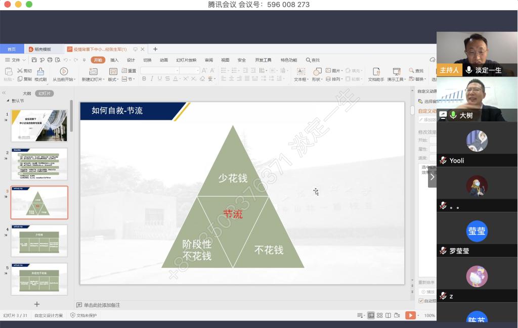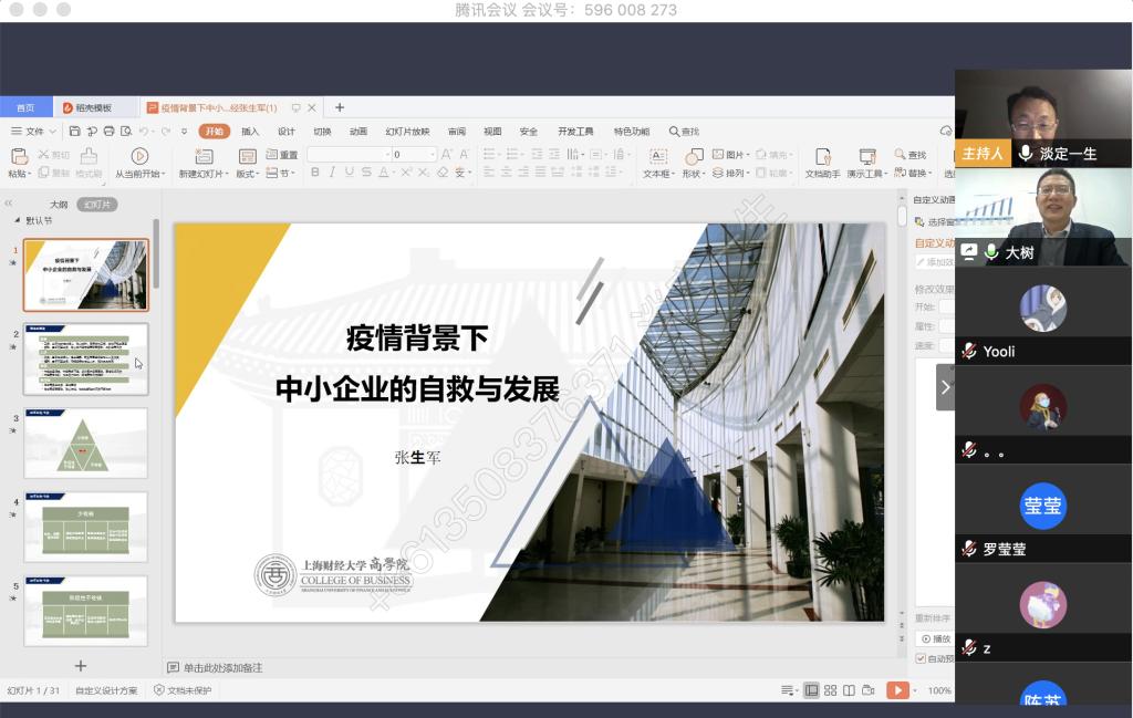 4月9日晚上,我校税务硕士教育中心通过腾讯会议举办了本年度第一次南山税务沙龙——疫情背景下中小企业的自救与发展。本次沙龙由我校尚可文教授主持,特别邀请迅驰车业江苏有限公司副总裁、上海财经大学硕士生导师张生军博士主讲。我校2019级税务硕士研究生参加了沙龙。