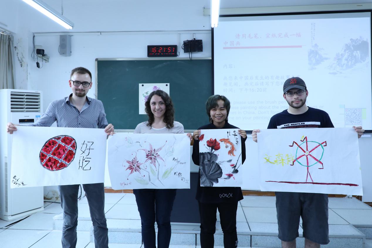 在“快乐体验中国画”的活动中,授课老师以时间为主线,向外国友人展现了我国不同时代、不同地区的国画。在活动中,外国师生各自体验了一些国画的绘画与创作,来自德国的Paul更是在自己的画作上展现了重庆的特色美味——火锅。“有创意、有想法,把火锅的火一般的麻辣鲜香表现出来了,用色也大胆、有激情,还用了中文在画上书写出“好吃”,表示出了他内心的快乐和对重庆味道的美好记忆。”老师如此评价他的作品。