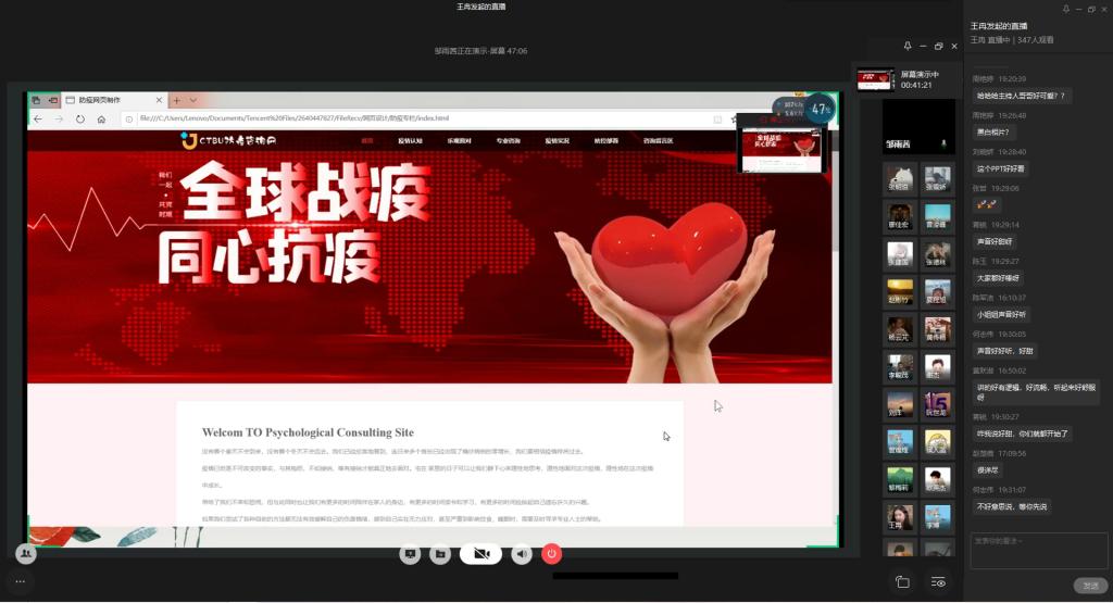 为弘扬伟大民族精神,厚植家国情怀,凝聚众志成城共抗疫情的强大力量,引导学生结合专业知识积极思考、实践,为抗疫贡献自己的智慧和力量,由校团委主办,计算机科学与信息工程学院、人工智能学院承办的“新儒商”大学生科技文化节之“共抗疫情,爱国力行”主题网页设计大赛决赛于6月12日晚上7点在企业微信直播间顺利举行。计信学院杨永斌副教授,杨艺副教授,唐灿副教授,赖涵博士应邀担任决赛评委。大赛邀请了校团委陆嘉副书记、计信学院党委陈亚惠副书记、校团委徐阔老师,计信学院学工办副主任向巧老师观摩指导比赛。决赛受到了各学院学生广泛关注,吸引了超过800人次的观看。