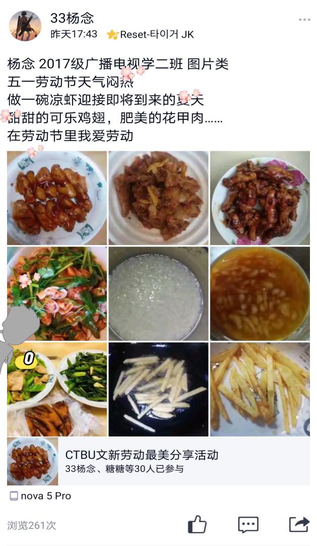 今年“五一”,文学与新闻学院的同学们都在忙着分享自己的劳动经验和劳动成果,让这个劳动节变得“不一样”。“这道菜一定要多放一点白糖,这样做出来的味道才够鲜美!”“我走在街上看着棒棒在烈日下扛着沉重的货物我在那一霎那感受到了劳动人民的力量。”