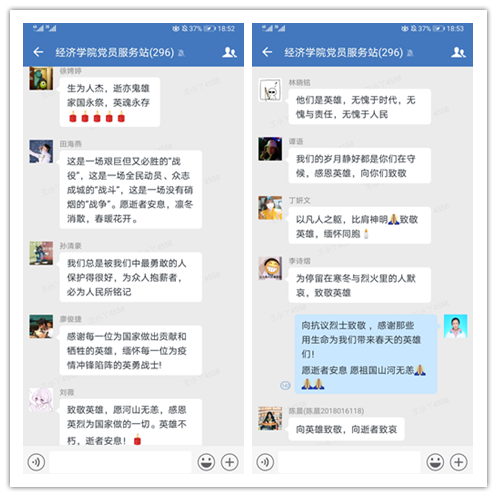 悼念仪式结束后,在经济学院党员服务站曲容良站长的带动下,同学们纷纷在群里倾诉哀思,“清明追思布谷鸣,家国永念康子春。”“以凡人之躯,比肩神明!”“我们的岁月静好都是你们在守候,感恩英雄,向你们致敬!”每一句都饱含同学们对英雄最真挚的敬意与最深切的思念。他们用血肉之躯抵抗病毒,以满腔热血奋战“疫”线,而我们能做的就是守护他们用生命换来的成果,用行动告慰逝去的同胞。