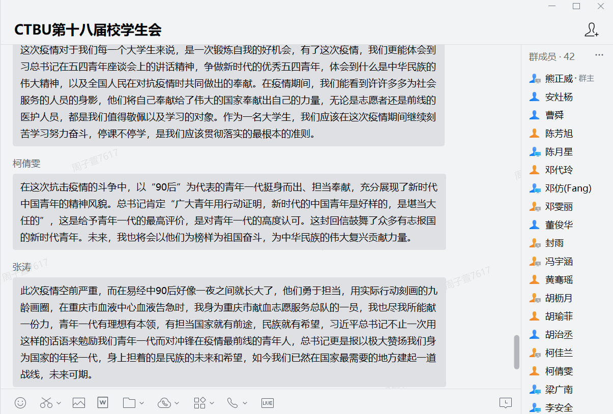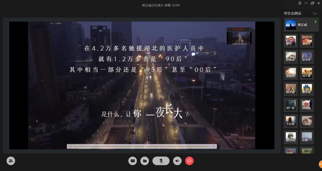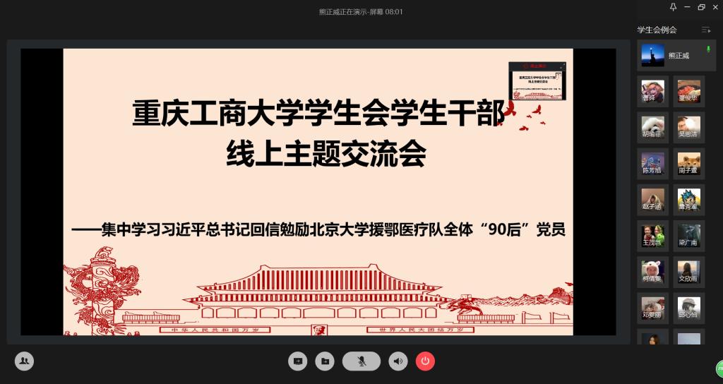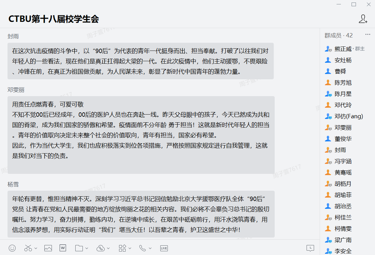 3月24日中午,校学生会在企业微信平台上集中学习《习近平给北京大学援鄂医疗队全体“90后”党员的回信》。