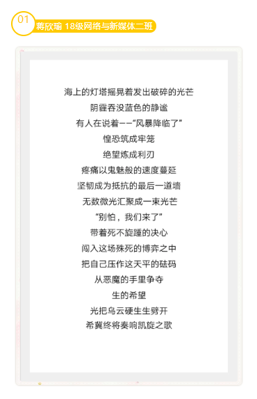 本次活动为期一个月,采用线上举行,截至2月18日,文学与新闻学院举办的“抗击疫情,我们在行动”系列活动已收集到248份作品,投稿作品分为文字类、图文类、视频类三个大类,共有宣传语、诗歌、短视频、海报设计、手抄报设计、口罩设计、美食你我晒等七个小类。投稿作品内容多为宣传防疫知识,不信谣不传谣,对此次疫情的观点和看法,以及致敬一线最美“逆行者”等。