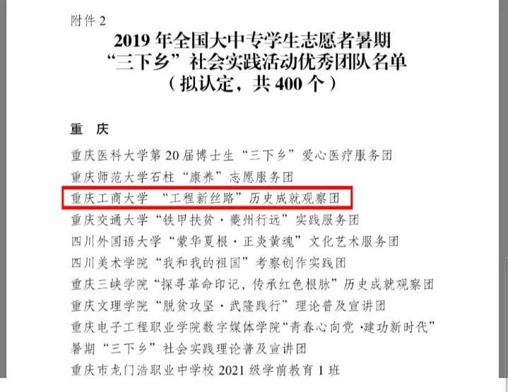 学校在全国大学生“一带一路”专项行动中获评优秀组织单位(全国50个);山城新贸调查队(管理学院BIM学生社团)获全国大学生“一带一路”专项行动优秀团队(全国75支);“工程新丝路”历史成就观察团(管理学院)获评全国三下乡社会实践优秀团队;“青春大学习•奋斗新时代”理论普及宣讲团(财政金融学院)获评团中央“镜头中的三下乡”优秀报道奖。