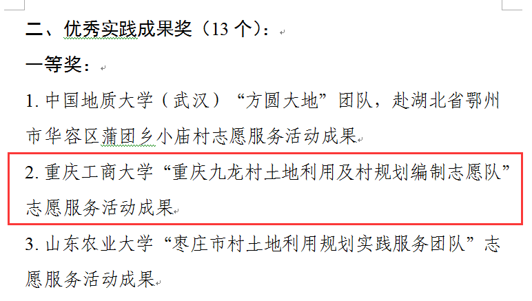 近日,2018年村土地利用规划志愿服务全国大学生暑期社会实践专项行动获奖名单公布,环亚平台_环亚(中国旅游与国土资源学院“重庆九龙村土地利用及村规划编制志愿队”获优秀实践成果一等奖。