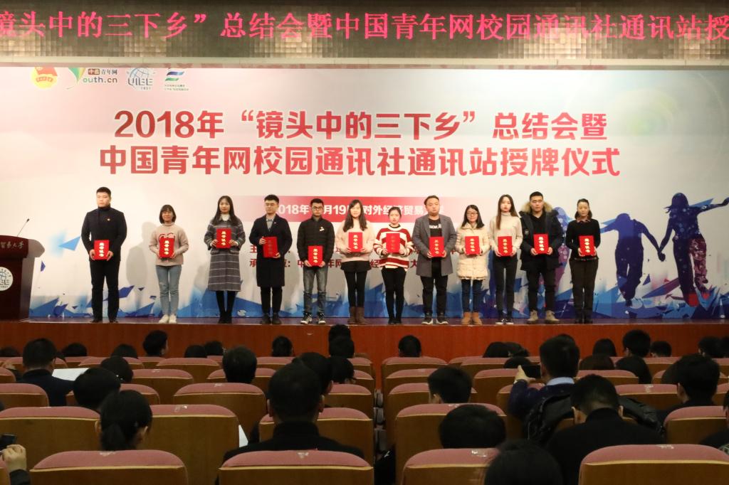 2018年12月19日,由团中央青年发展部、团中央网络影视中心主办,中国青年网、对外经济贸易大学团委承办的2018年“镜头中的三下乡”总结会暨中国青年网校园通讯社通讯站授牌仪式在对外经济贸易大学举行。财政金融学院三下乡团队队长林哲苏赴北京参与本次会议。此次会议包括清华大学、中央财经大学、华中师范大学、武汉科技大学等300余所高校参加。在本次由团中央举办的2018年“镜头中的三下乡”活动评选中,我校财政金融学院荣获全国百强传播力团队表彰。