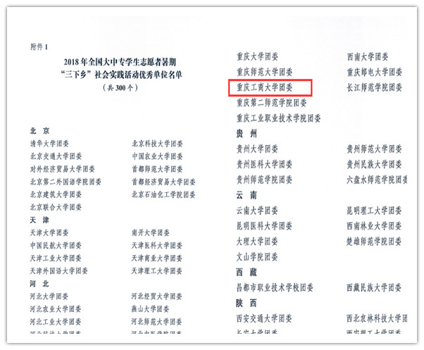 11月16日,全国大学生志愿服务西部计划项目管理办公室下发了《关于对在2018年西部计划招募宣传工作中表现突出的项目办进行通报表扬的通知》,对包括我校在内的185个高校项目办提出通报表扬。11月20日,团中央学校部、全国学联秘书处下发了《关于2018年全国大中专学生志愿者暑期“三下乡”社会实践活动通报》,我校校团委获评全国优秀单位(全国共评选300个)。