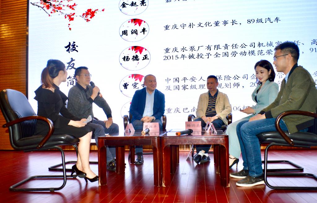 启动仪式后开展了“校友与你面对面”主题分享活动。此次活动邀请的校友为89级机制专业嘉兴富海投资管理有限公司董事长金赵亮,89级汽车专业重庆守朴文化董事长周润丰,91级机制专业重庆水泵厂有限责任公司机械室主任、高级工程师,全国劳动模范杨德正,03级包装专业任中国平安人寿保险公司企业高管的曾宪林,06级机制专业就职于重庆市巴南区建委的杨扬。五位校友分别分享了他们学生时代和工作后的经历,也对学生们提出了自律、好学、团结、阳光、严谨的期望,希望学生们能从专业学习过程中找到价值感、成就感,呼吁学生们用心了解专业,感受专业,热爱专业,脚踏实地走好每一步,着眼当下,展望未来,不断积淀历练。本次学生科技创新文化活动月全程由校友赞助。